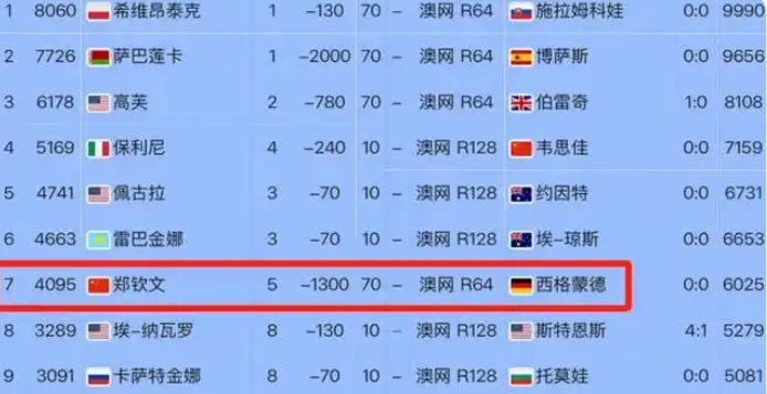 郑钦文为何会被扣除1300分呢?并非是被针对了,而是寰宇排行次序带来的,按照WTA的章程,跟着本领前进,郑钦文在前年得到的澳网积分落后了,是以被扣除了。这一次的寰宇排行改革,多名球员澳网的积分齐被扣除,比如说此前的女单寰宇第1萨巴伦卡在前年澳网拿到了冠军,拿到了2000分的积分,萨巴伦卡的2000积分相通到期被扣,这也让萨巴伦卡丢掉了女单寰宇第1的位置。除了郑钦文和萨巴伦卡以外,高芙被扣除780分第三多的通顺员。