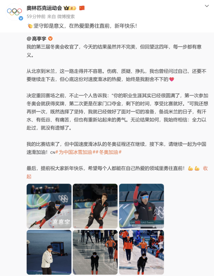 随后,奥林匹克官方转发并配文:“信守便是料想,在疼爱里前仆后继,新年繁荣!”