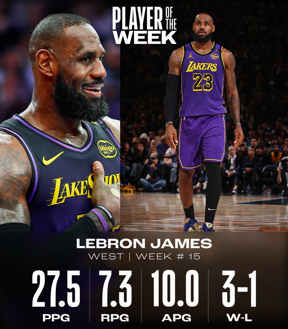 虎扑02月04日讯 当天,NBA官方公布了第15周的最好球员,勒布朗-詹姆斯荣获西部周最好球员。