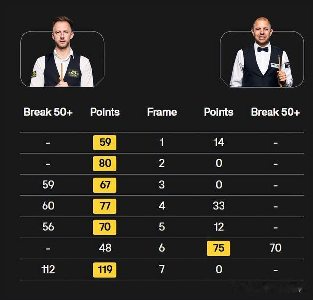 第六局,霍金斯拼球上手,单杆70分超分,特鲁姆普追分,两次高难度斯诺克,王人被霍金斯精彩化解,最终偶精神75-48追回一局。第七局,霍金斯失实,特鲁姆普单杆112分锁定胜局。