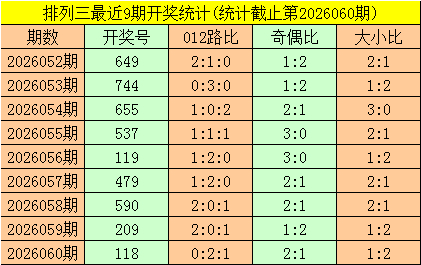 一、摆列三第2026060期开出号码118,其奇偶比为2:1,大小比为1:2,号码012路比为0:2:1。该号码直选历史上出现了3次。